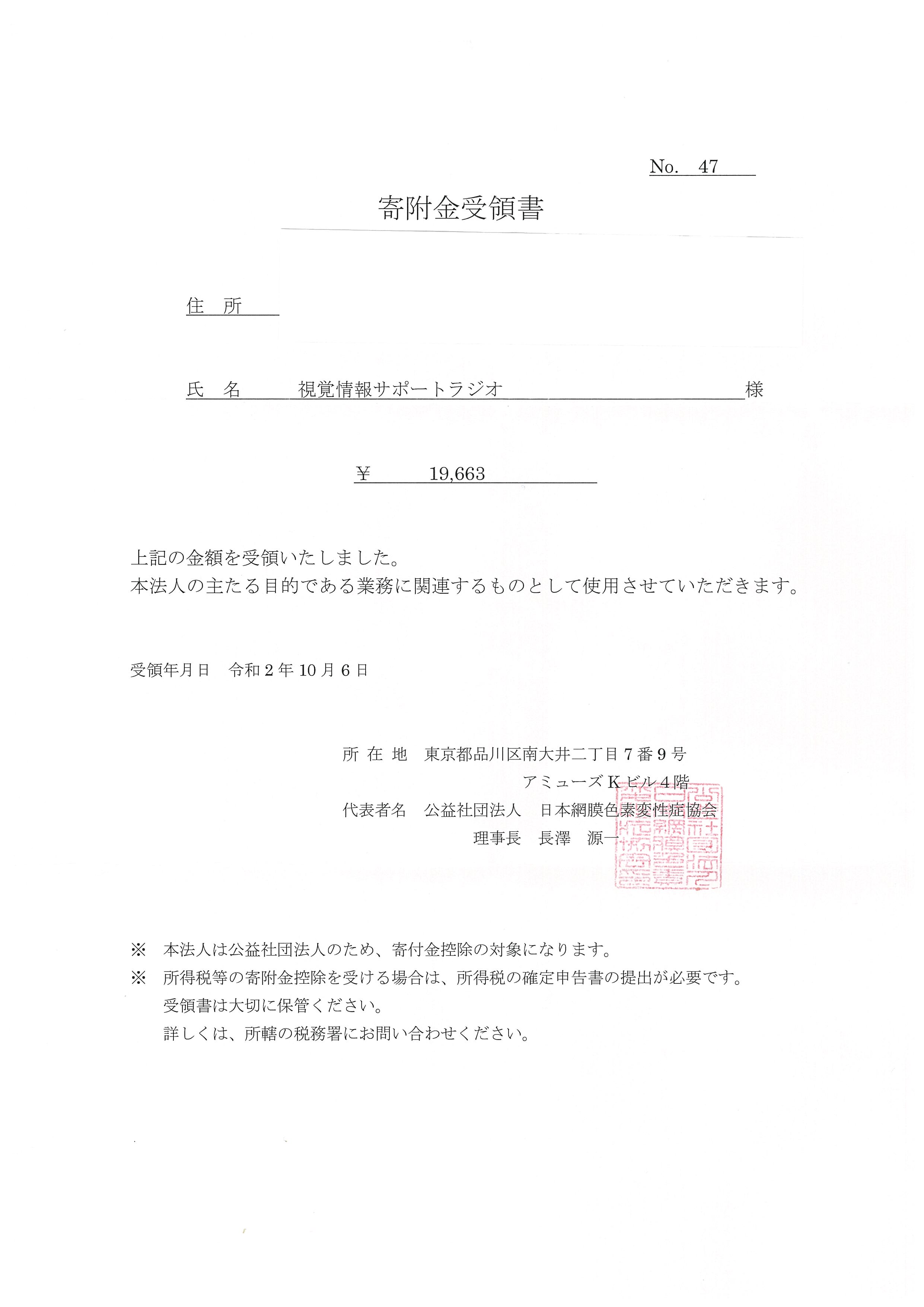 JRPS(日本網膜色素変性症協会)より送付いただいた視覚情報サポートラジオ宛のスーパーライブ2020での「網膜募金(総額19663円)」の受領書を、公開いたします。なお、ファイルはjpgの画像データになりますので、閲覧される場合、スクリーンリーダーなどの音声読み上げには対応しておりません。どうぞご了承ください。